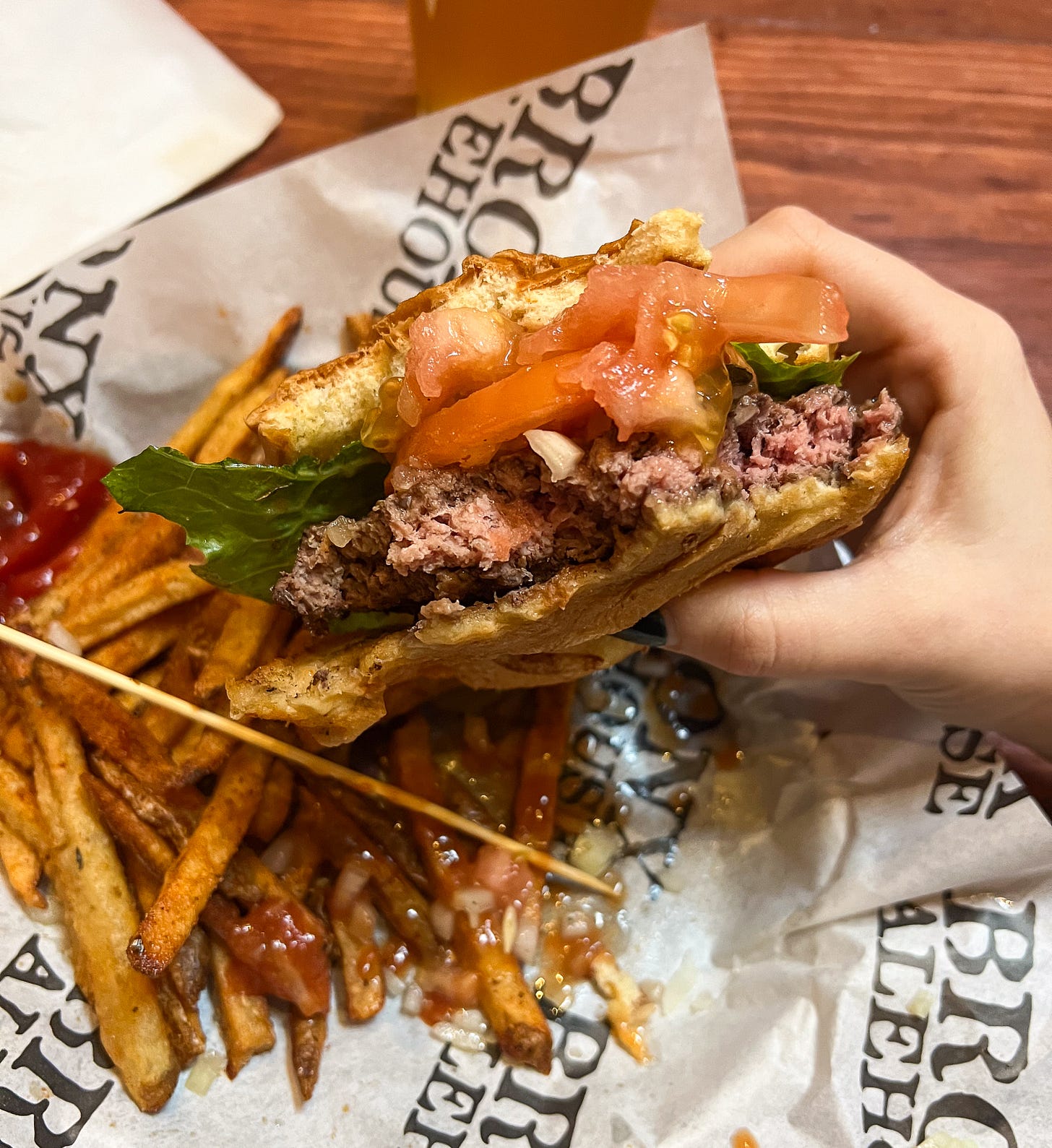 My first bite was super juicy and well balanced. Any time I have a burger on brioche, I’m grateful for any crunch and moisture I can get from fresh veg. The pickles were plentiful and briny and for the record didn’t really taste all to IPA-y to me. The further into the burger I got, though, the more the moisture from the lettuce and off-season tomato conspired with the medium burger to make things a bit messy. This meant a few things: the finely diced onion ended up pooled on the plate instead of in my mouth, the bottom bun got thinner and thinner, and the supersized piece of lettuce was basically ice skating across the patty.