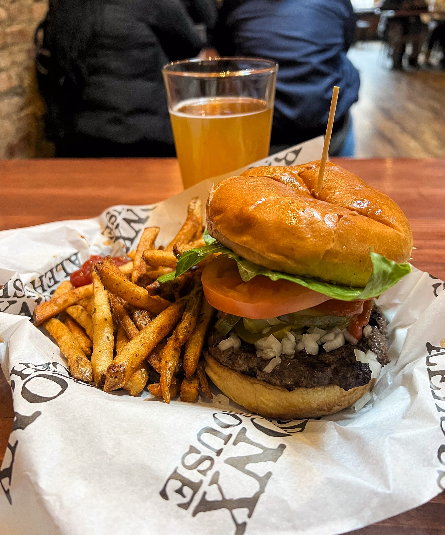 I landed on Bronx Alehouse in Riverdale Crossing, around the corner from the penultimate stop of the 1 train. It’s a spacious sports bar with TVs around the perimeter of both the bar and the dining room and a pretty robust draft list. I settled into a back corner table with my book and ordered a pint (airport rules) and their Original burger, one of the eight burger options.