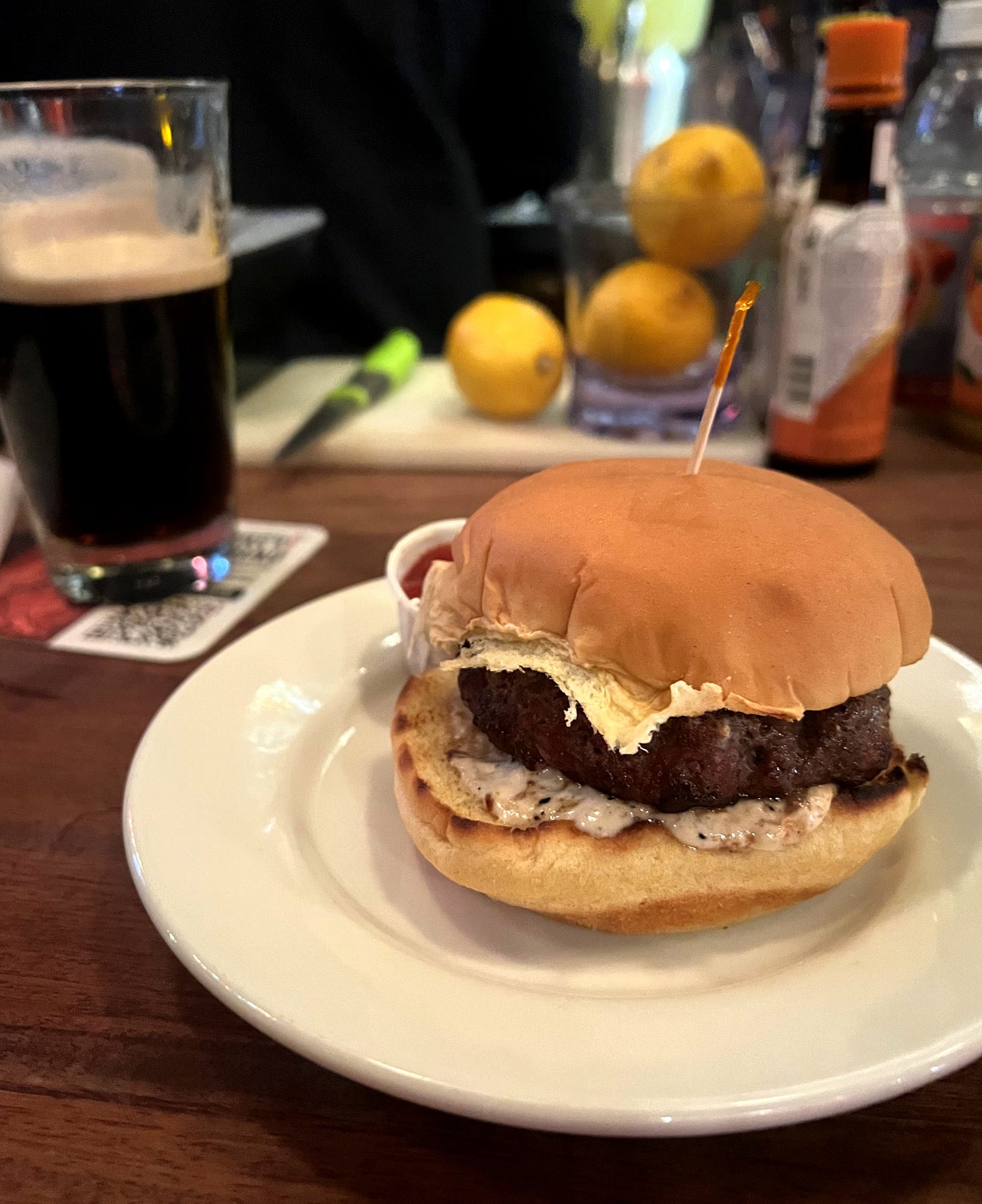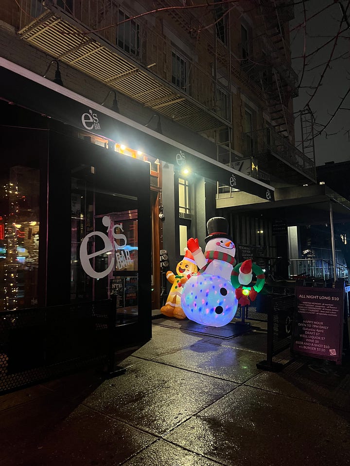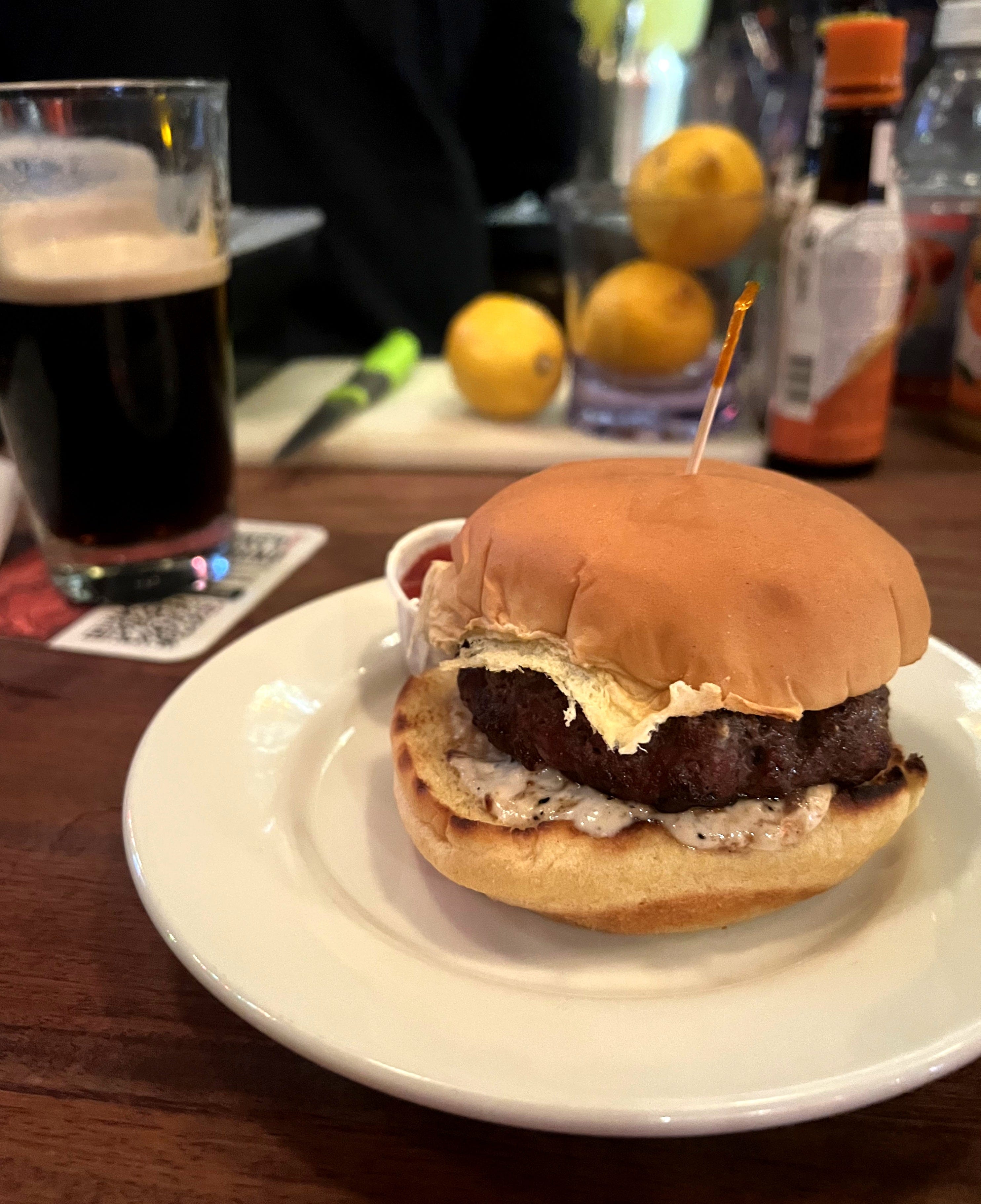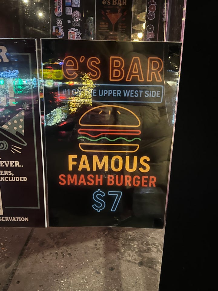 After perusing some Reddit threads and listicles, I decided on E’s Bar on 85th and Amsterdam. Big leather booths, weekly trivia, some dartboards, and Guiness on tap - all hallmarks of a trusted neighborhood spot. The menu ran pretty deep and featured seven burgers, including one with a falafel patty. The headliners are E’s Burger (pub style for $12), and the E’s smash burger for $7. I asked the bartender which he preferred and recommend I go pub style, especially if I was hungry. I requested my burger no cheese and got served pretty quickly!