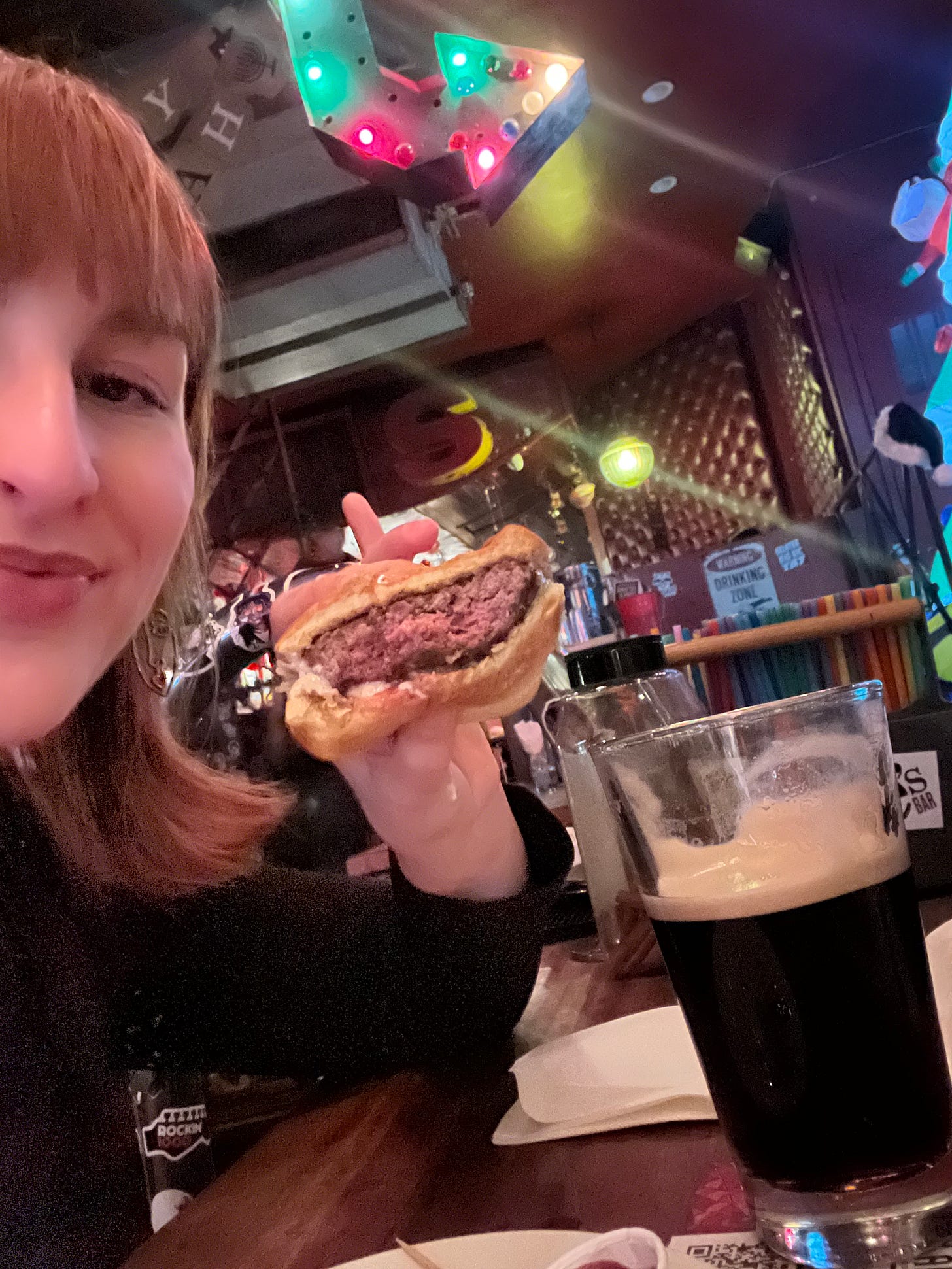 Other than the slice of American, the burger just came with a house sauce, which the bartender described as an onion garlic aioli. To me it evoked a French onion dip - not mad! I forgot to ask for the fresh toppings, lettuce + tomato + pickle, but it was also a $2 upcharge which I haven’t really seen before. The E’s Burger came on the classic Martin’s potato bun.