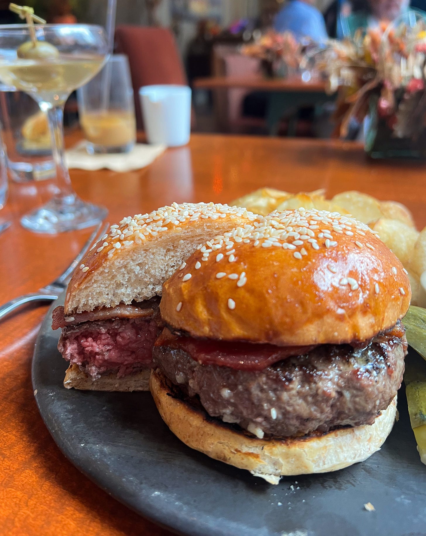 The burgers at Gramercy Tavern are all cooked to medium rare by default, which means in order to get clean cut, the burger needed to sit for a spell while the juices redistribute. I’m not opposed to cutting your burger in half once it hits the table - still hot, eaten almost immediately.