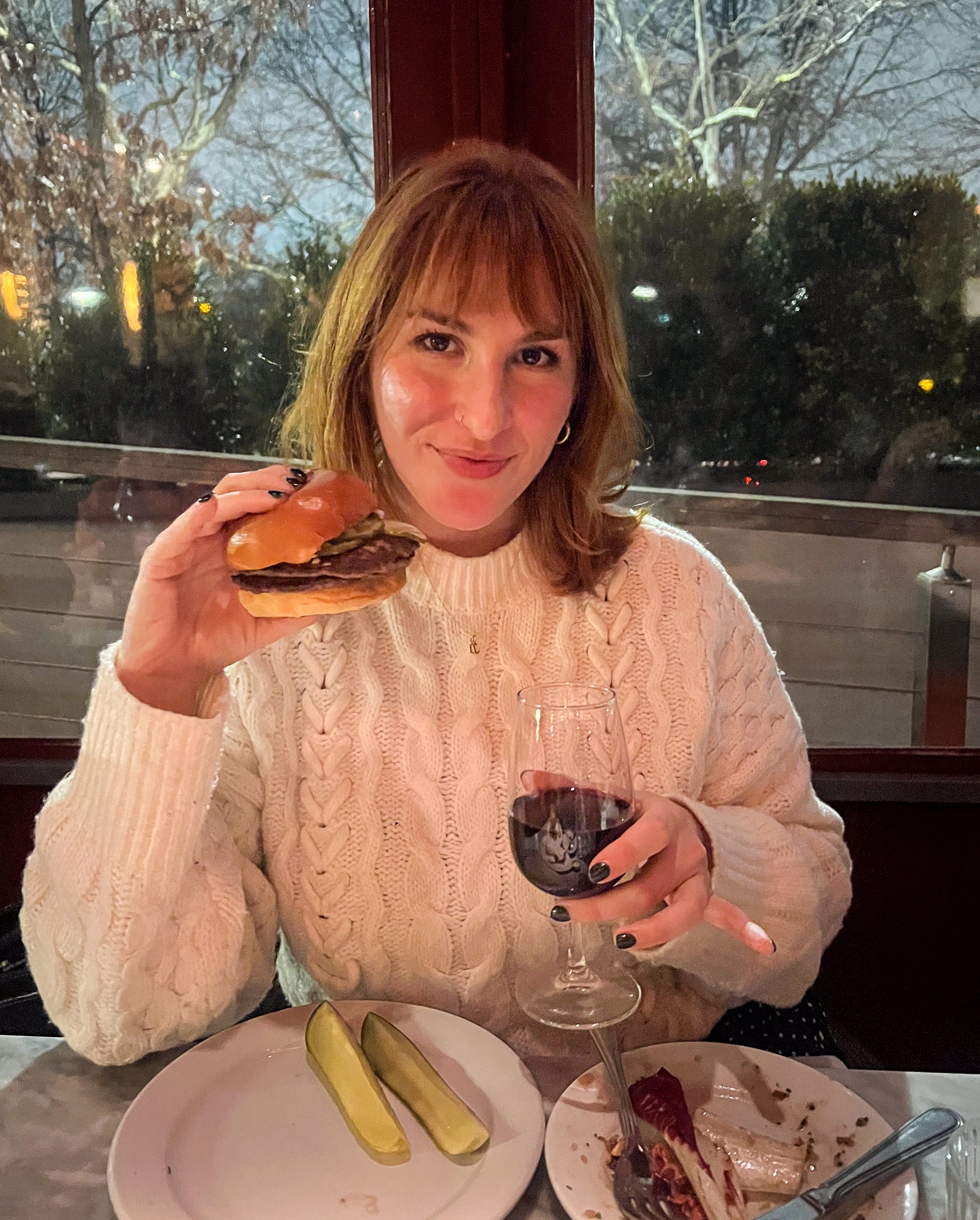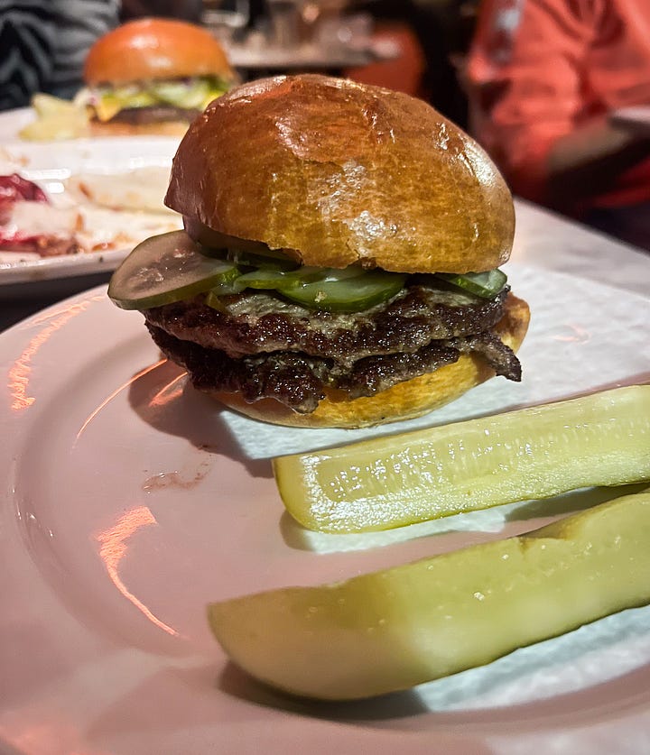 My friend Madison and I started with some drinks and a salad to share for the crucial post-holiday vegetable and both of us got the burger, mine sans cheese and hers with. The burgers here are double smashes on pillowy brioche buns, topped with pickles, onions and a mustard aioli for $19.