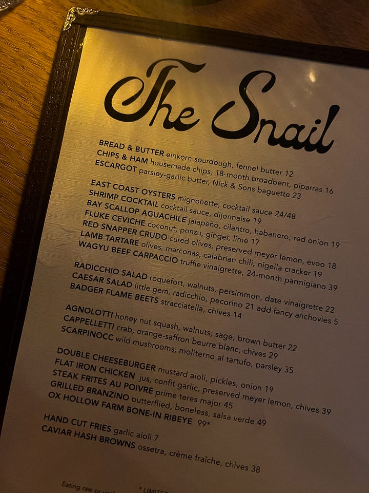 One of these walk-in only spots is The Snail in Greenpoint, right across from McCarren Park. It opened in November 2024 and by spring 2025, word spread and folks were lined up outside the slightly sunken-in bistro over half an hour ahead of opening. When Eater paid them a visit in March, they were quoted a wait of 1.5 hours at a quarter after 5. But when I swung in last Friday around 5:45, I was sat straight away, probably helped by the fact that I dined on what is traditionally the slowest week of the year for restaurants.