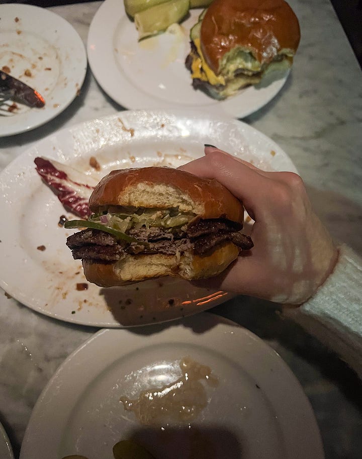 Within two bites of my burger I had a moment of deja vu. Why did this burger taste so familiar? The buttery sweet bun, smashed salty patties, super thin pickles and very finely diced onion, the scantly spread slightly mustardy sauce. It hit me - McDonald’s. I am eating gourmet McDonald’s. The flavor profile, the textures. Le McDonald’s. Don’t get me wrong: Good McDonald’s! The McDonald’s you’d get after dance practice or your soccer game as a kid.